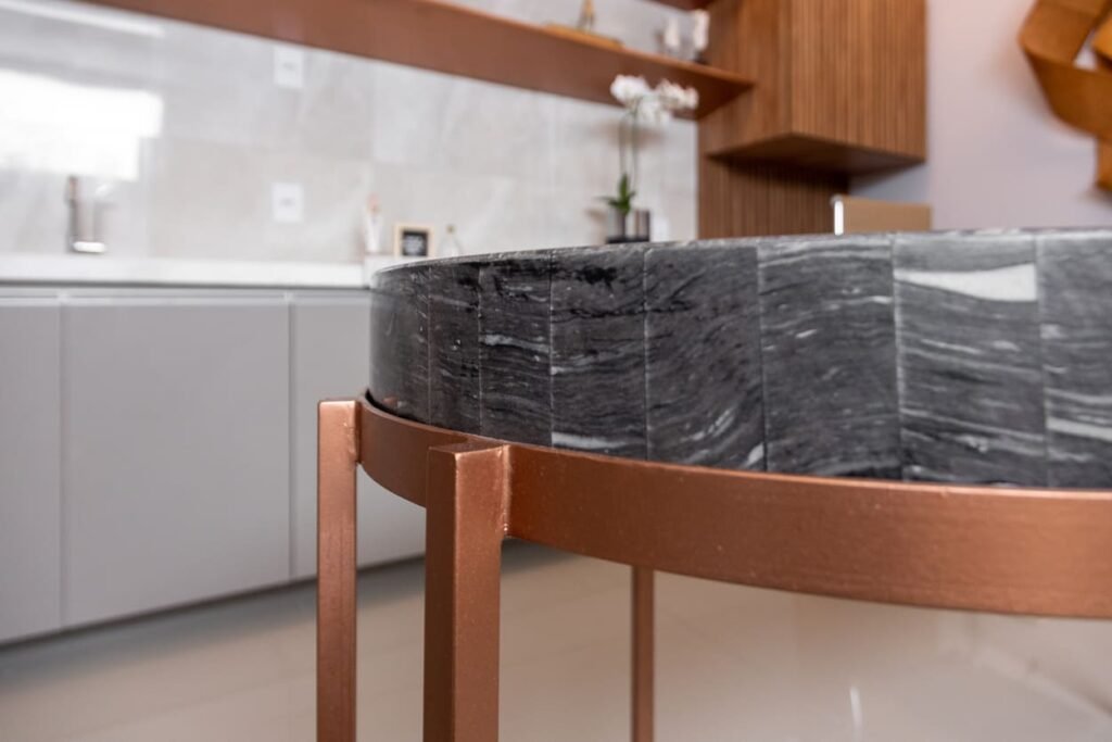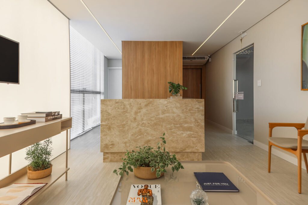 Sala com lareira em pedra importada Grigio Gucci – Projeto Arquiteto Felipe Moreno