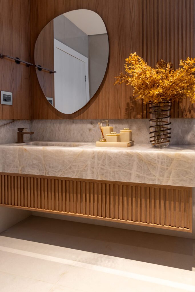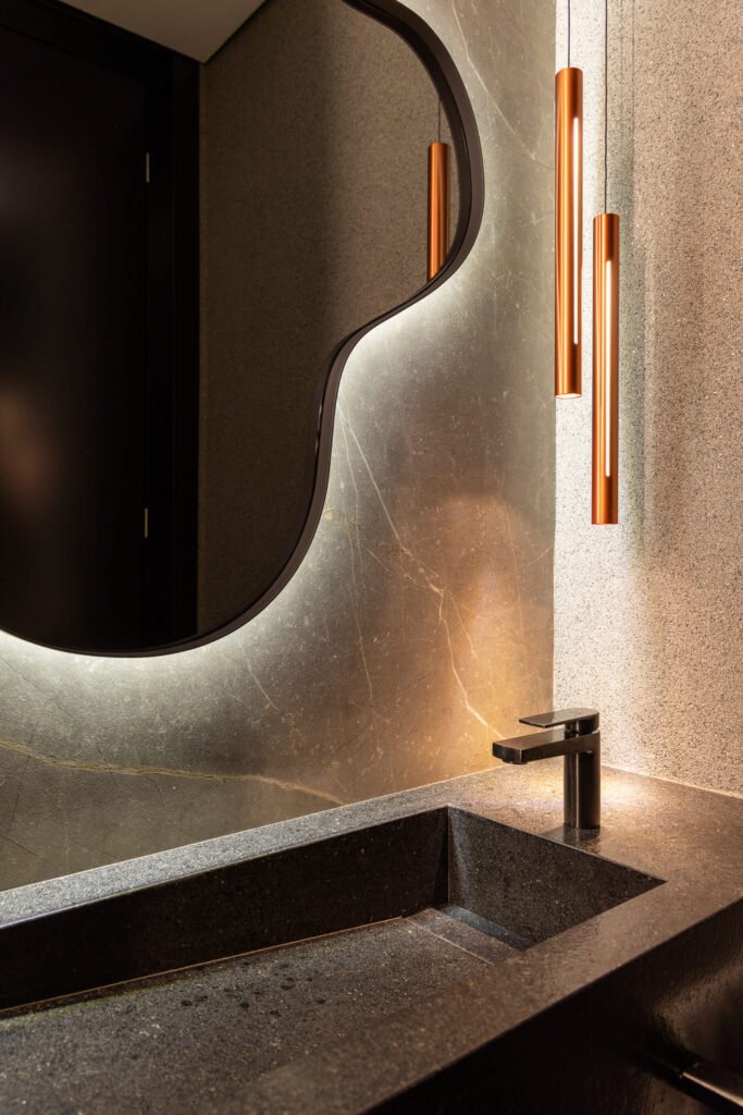 Lavabo com bancada com cuba esculpida e nicho em Ônix Translúcido – Projeto Laura Figueiredo