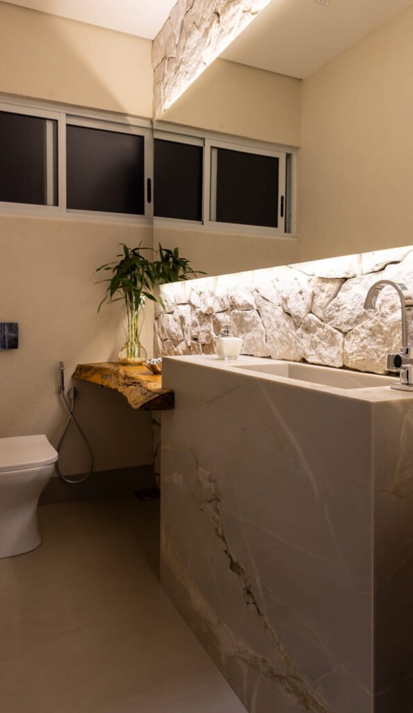 Lavabo com Cuba em coluna em Quartzito Mont Blanc Escovado – Soli Projetos