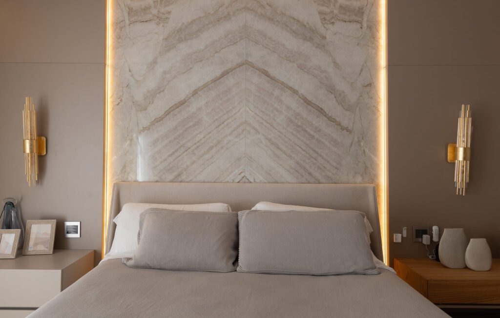 Suíte casal com cabeceira em Quartzito Taj Mahal – Projeto Laura Figueiredo